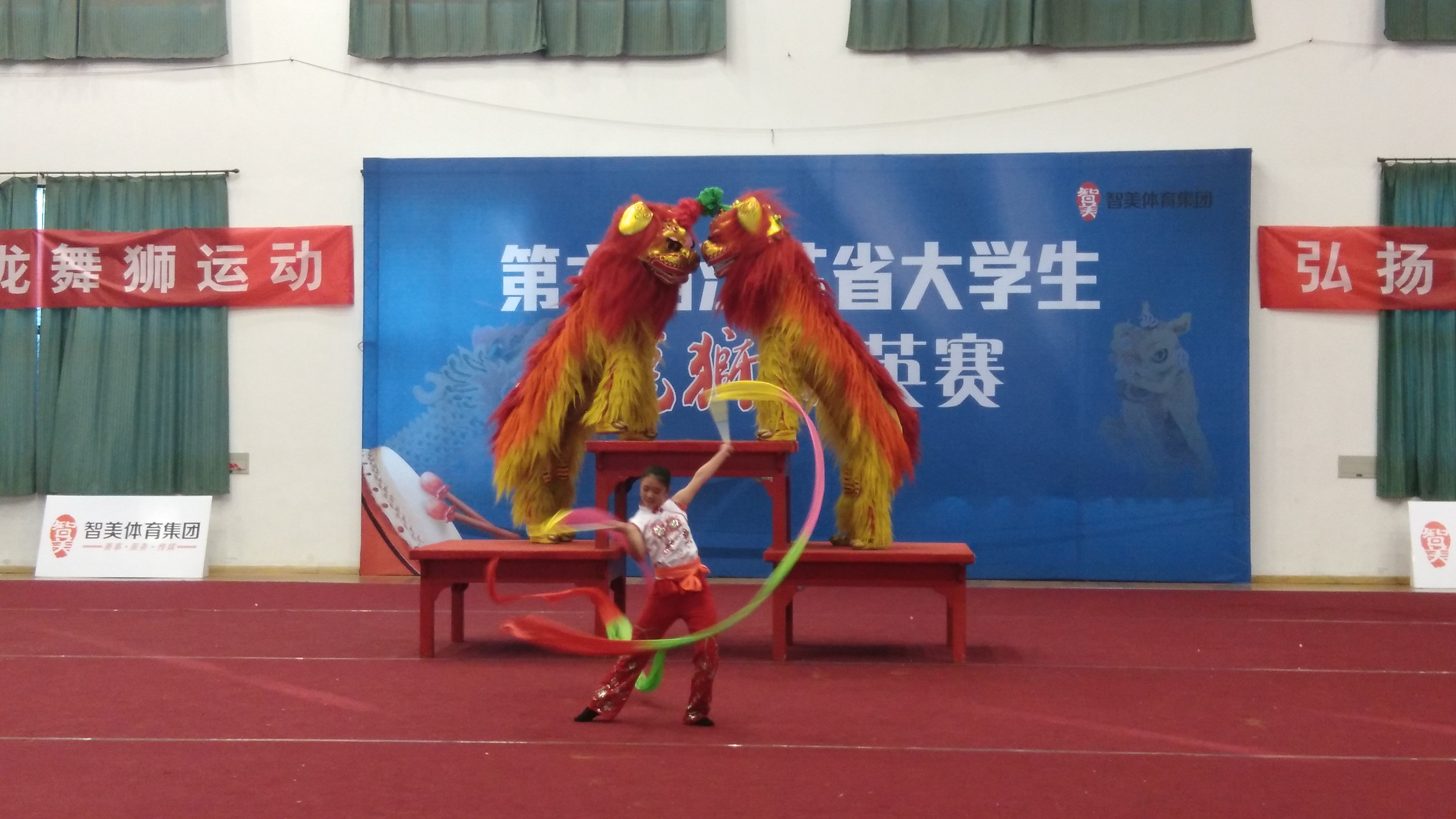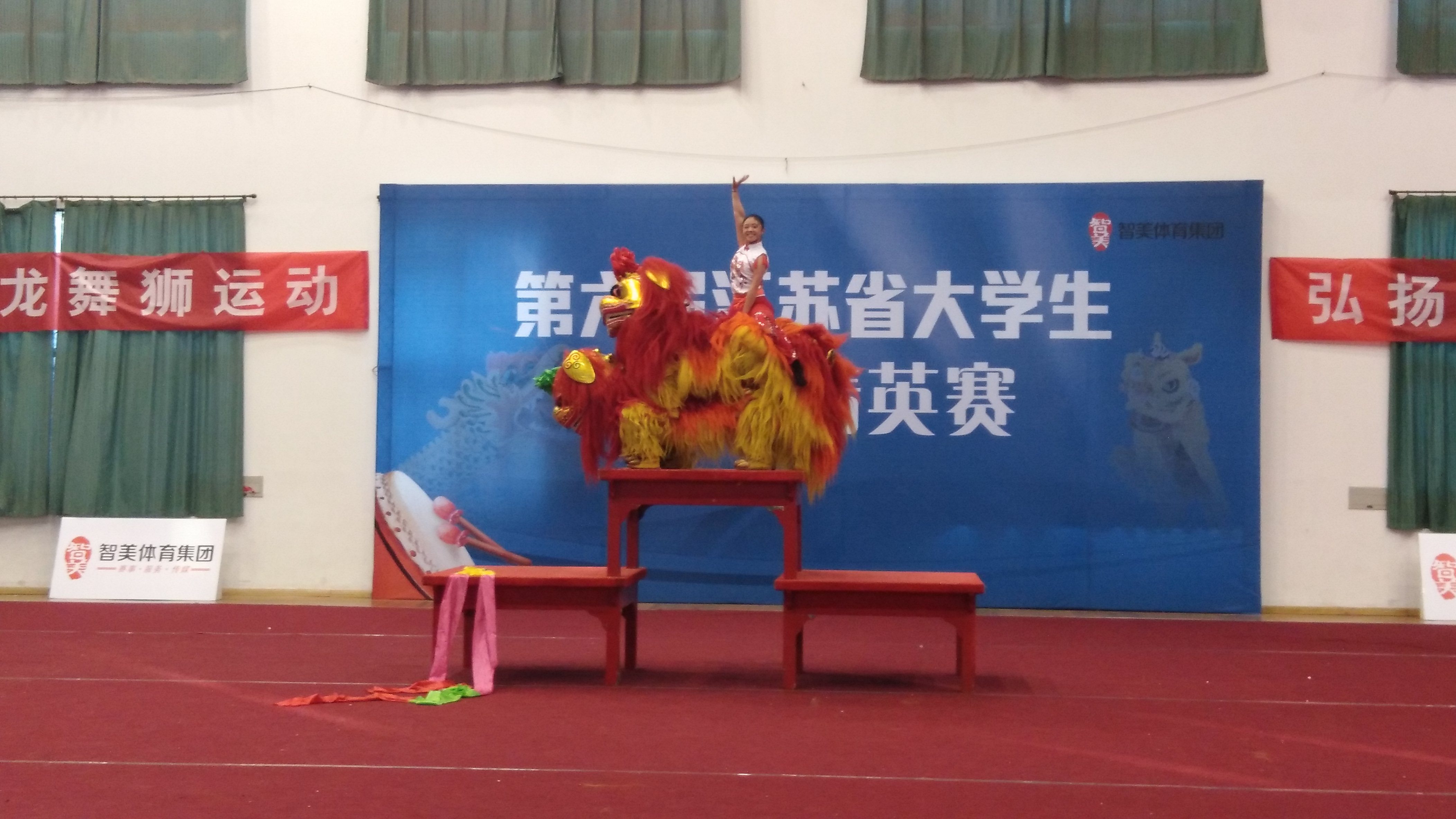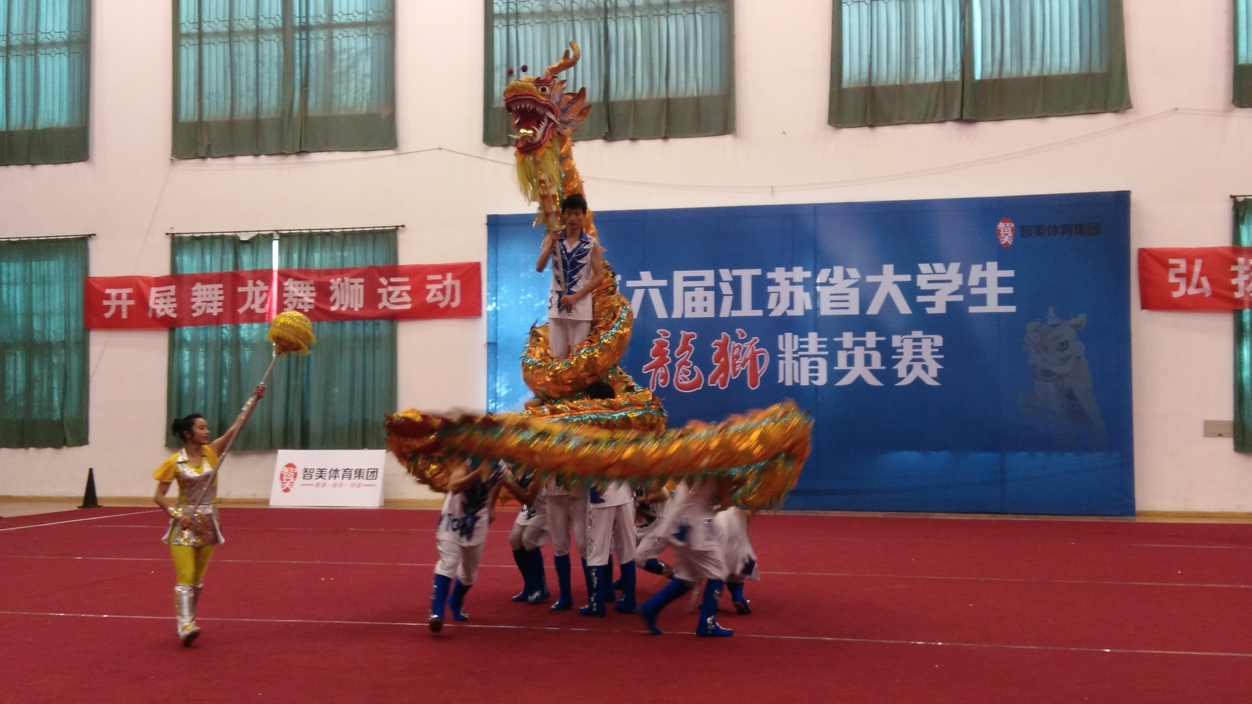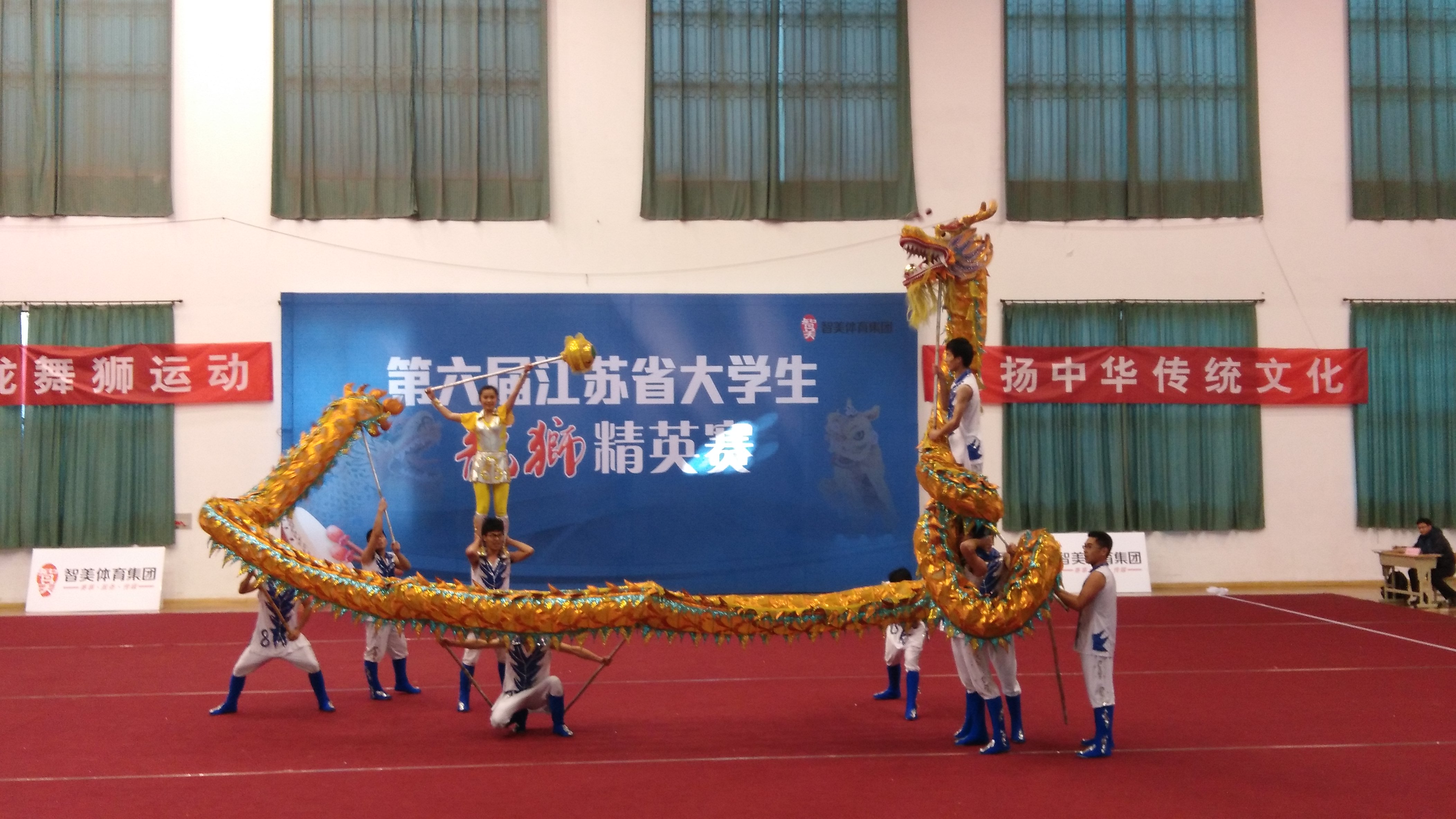 20151211-12日,由江苏省社会体育管理中心、江苏省学生体协高校工作委员会、江苏省龙狮运动协会主办的第六届江苏省龙狮精英赛在南京理工大学隆重举行。江苏省政府办公厅主任,省龙狮运动协会会长谢润盛、省社会体育管理中心主任刘陶、南京理工大学党委副书记陈岩松等出席了开幕式并为龙狮点睛。大赛共有来自全省十三所高校的运动队同台竞技,包括南京理工大学、南京工业大学、苏州大学、江苏师范大学、南京晓庄学院等传统劲旅的8支舞龙队、10支北狮队共18支队伍近180多名运动员参加了角逐。我校龙狮团顽强拼搏,获得舞龙舞狮全能铜奖和体育道德风尚奖,吴明琼、苏博文、张彬荣获体育道德风尚奖运动员称号。